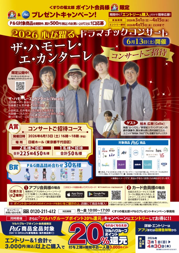 くすりの福太郎で対象のP&G商品をご購入いただくとご応募いただけるプレゼントキャンペーン『ザ・ハモーレ・エ・カンターレ コンサート』にゲスト出演させていただきます!