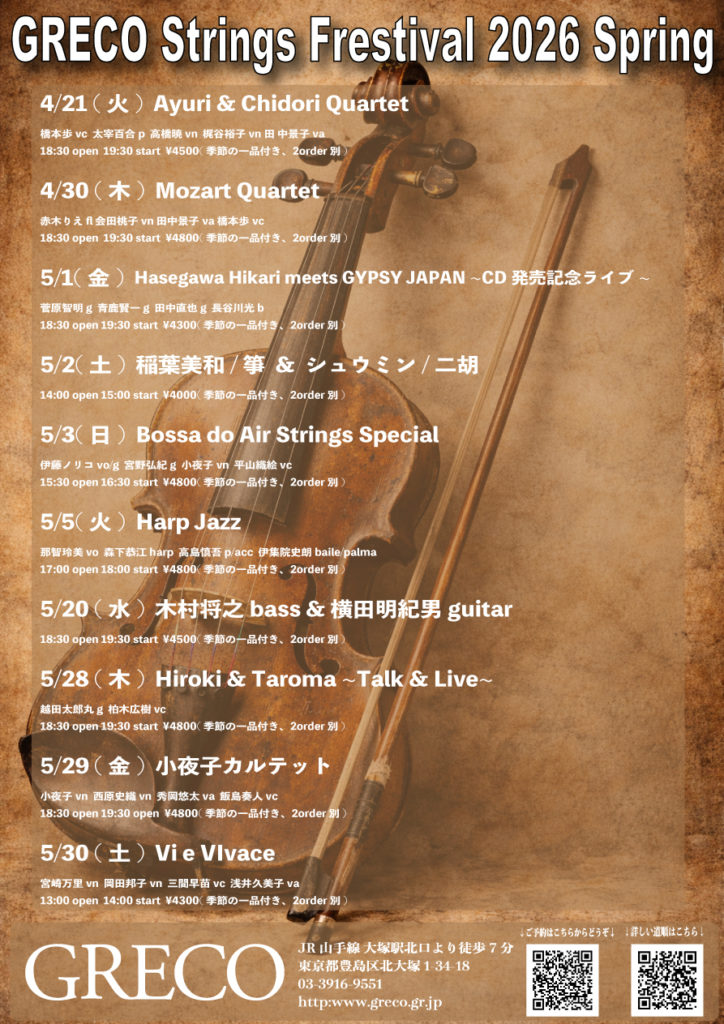 GRECO Strings Festival 2026 Spring 越田太郎丸&柏木広樹 2026/5/28【東京】出演!
